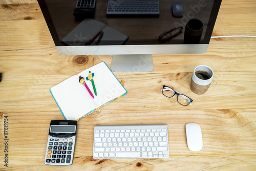 Office desk table with computer, supplies and coffee cup, white blank notepad, cup, pen, pc, Spectacles, calculator on wooden background, Top view