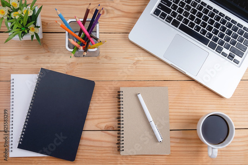 Office desk table with smartphone, pen on notebook, cup of coffee and flower. Top view with copy space (selective focus)..