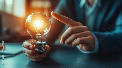 Office executive holds a glowing lightbulb, representing fresh ideas and demonstrating innovation and creativity in the business world