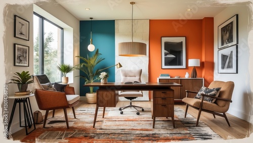 Office interior with desk and chairs. Teal and orange color wall with decorative elements in modern style. Lamps provide ambient lighting. Plants and decor enrich space.