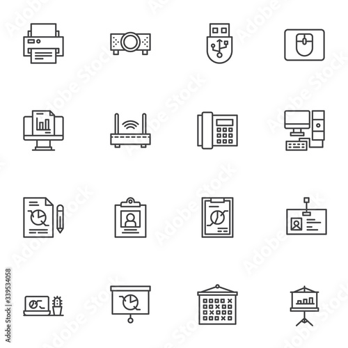 Office tools line icons set. linear style symbols collection, outline signs pack. vector graphics. Set includes icons as printer, projector screen, computer mouse, wifi modem, telephone fax, documents