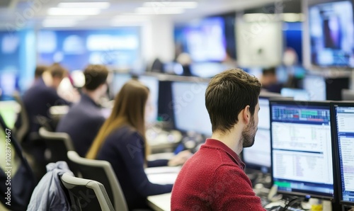 Office workers using computers, focus on man.