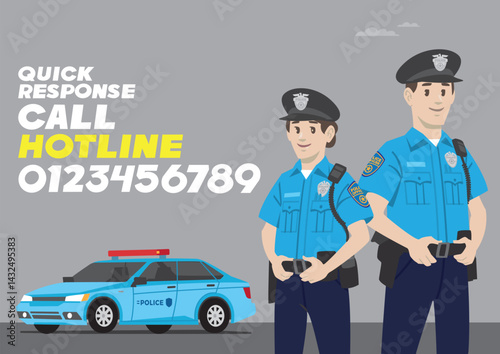 officer of law man and woman standing on police car with uniform and badge wearing hat and police gears horizontal format poster