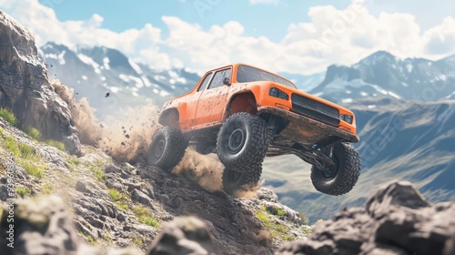 Offroad car race, vehicles bouncing over rugged terrain, 3D illustration
