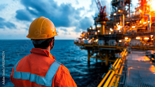 Offshore technician in safety gear observes oil rig at sunset, showcasing vibrant lights and industrial setting. scene captures essence of hard work and dedication