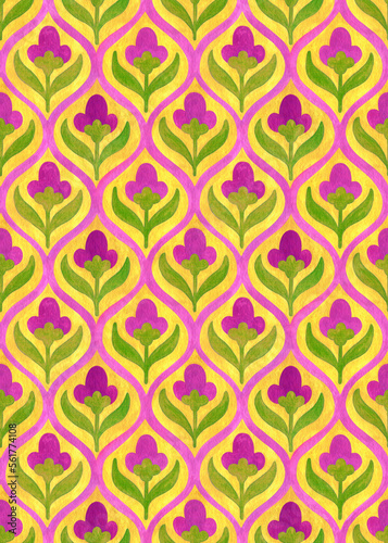 Ogee seamless pattern drawn with gouache. Handwork with paints on paper. Print for textiles, packaging.