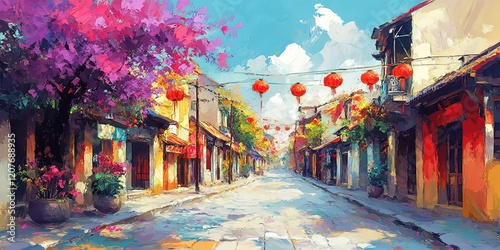 oil painting illustration, calm peaceful Vietnam old town road with house along the way