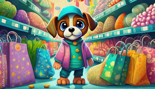 Oil painting style Cartoon character baby dog shopping in the supermarket
