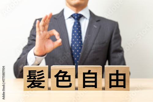 「髪色自由」と書かれたブロックとOKポーズをするビジネスマン