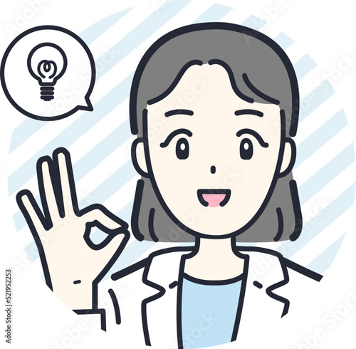 豆電球マークとポジティブな表情でOKサインをする女性医師の丸アイコン素材
