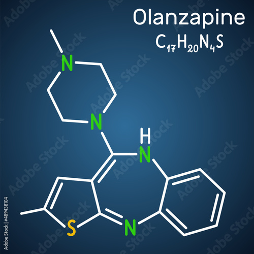 Olanzapine molecule. It is atypical antipsychotic drug for the treatment of schizophrenia, bipolar disorder. Structural chemical formula on the dark blue background