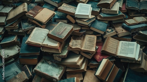 Old and used hardback books or text books seen from above. Books and reading are essential for self improvement, gaining knowledge and success in our careers, business and personal lives.