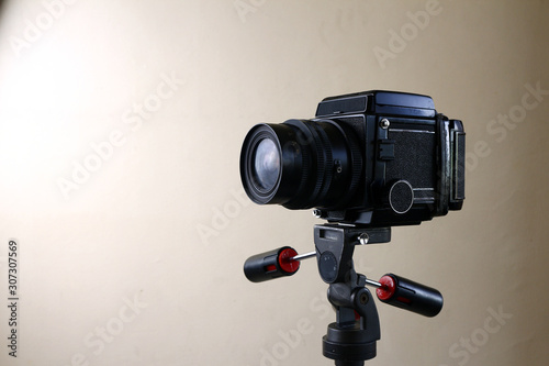 Old and vintage medium format film camera on a tripod