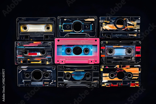 Old audio tape compact cassette on black background. Collection of retro cassette. Vintage pattern. 80s and 90s funky colorful design