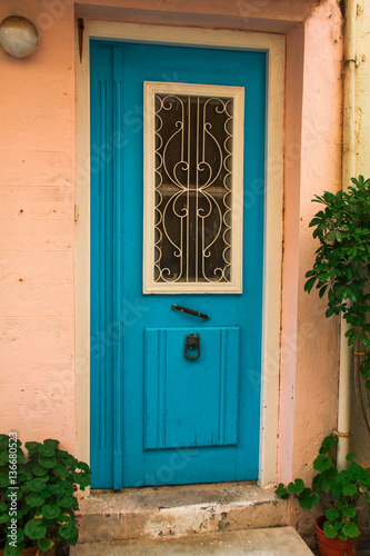 old blue wooden vintage painted door of greek island, Crete, Greece, traditional colorful facade