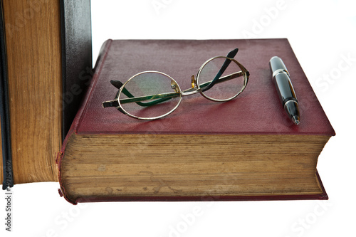 Old books with eye glasses and pen isolated on white background