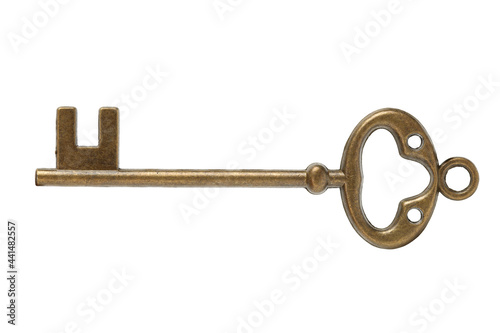 old brass key against a white background