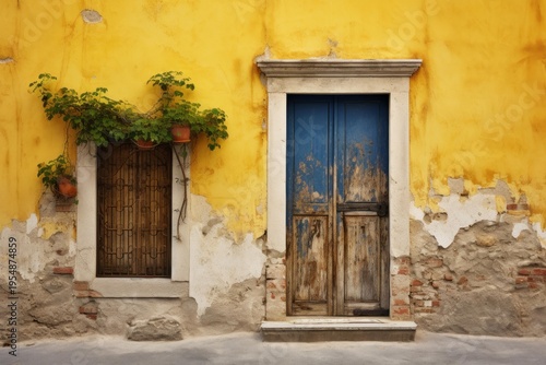 Old building facade featuring peeling paint, a blue door, and a window with plants