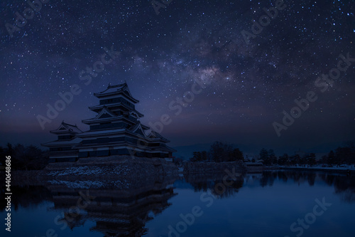 Old castle in japan. Matsumoto castle against night sky. Castle in Winter with milky way on sky .Travel Matsumoto Castle with frozen pond in Winter. A Japanese premier historic castles