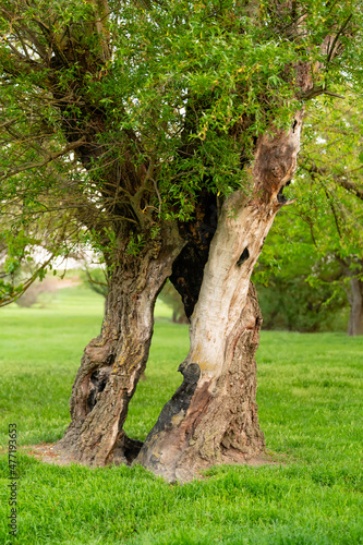 Old chopped willow tree with on the lawn