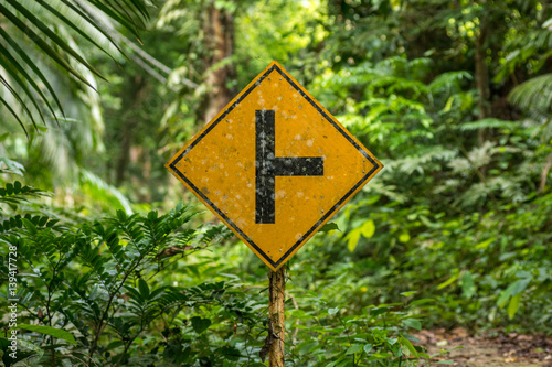 Old dirty Yellow and black dirtection junction road sign on post with jungle background.