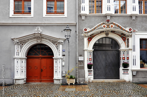 Old doors adorned with decorative elements in Goerlitz, Saxony, Germany.