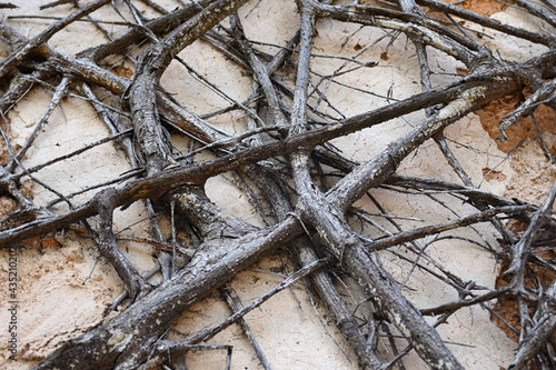 Old, dry tree roots had spread out along the side of the building. Organic background, texture of tree roots. Beautiful wooden background.Close-up shot of climbing roots