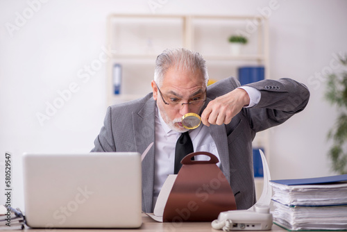 Old male employee eating cake in the office