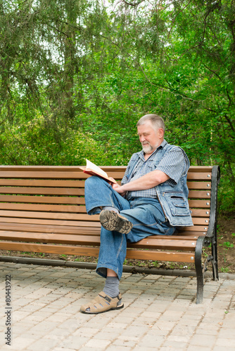 old man reading a book on a park bench