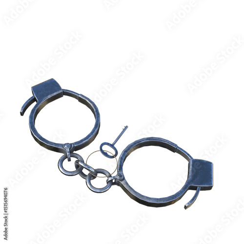 Old Metal Hand Restraint Device with Tiny Key Isolated on White Background