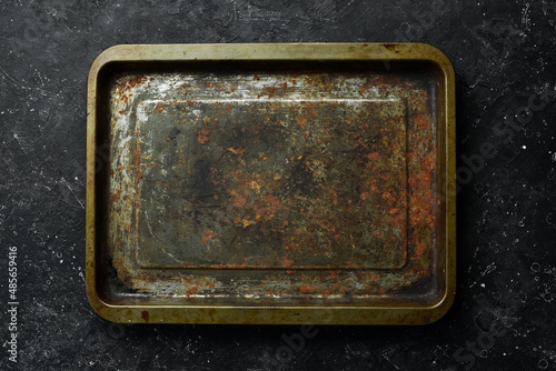 Old metal tray on a black stone table. Top view.