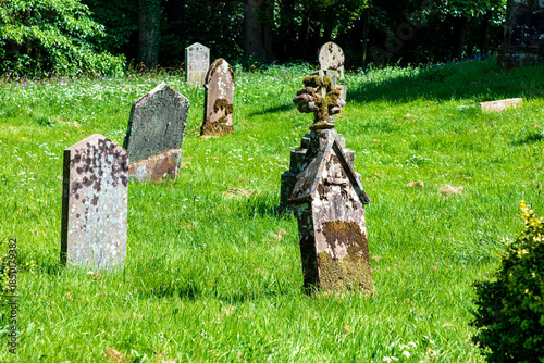 Old mossy gravestones in sunlit cemetery at St Peter's Church in Askham create quiet, serene historic landscape