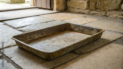 Old Rustic Baking Tray on Stone Floor, rustic baking tray, old metal tray, natural stone
