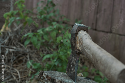 Old rusty axe with wooden handle stuck in the stump Large ax in hand