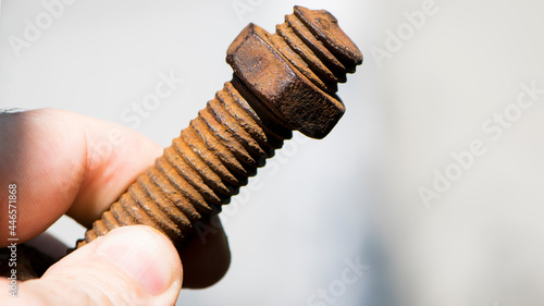 old rusty bolt, iron rod with screw threads, in hand. Rusted mechanical components. holding threaded bolt and nut. dismantling concept, difficult to unscrew, non-removable. isolated on light, close-up