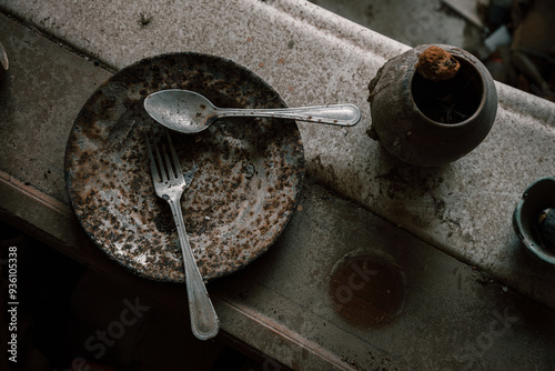 Old rusty plates in an abandoned hotel. Gloomy view. Antique objects in an abandoned building.