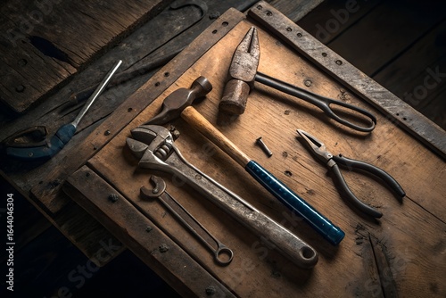 Old rusty tools on a wooden table in a carpenters workshop