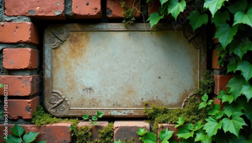 Old stone plaque worn smooth by ivy and moss, nestled in a nook of an ancient brick wall, stone, weathering