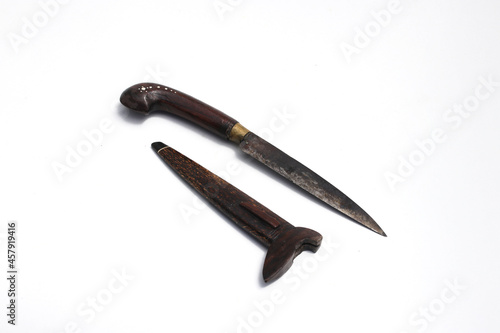 Old used Indonesian Knife with handle and knife scabbard made from wooden isolated on white background
