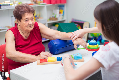 Old woman exercising on physical therapy with help of physiotherapist in the hospital.