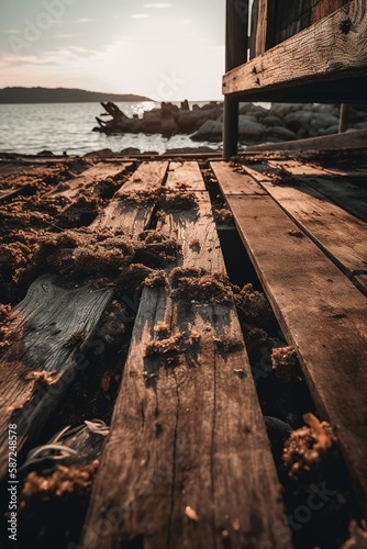 Old wooden pier on the beach at sunset. Selective focus. Toned.Generative Ai