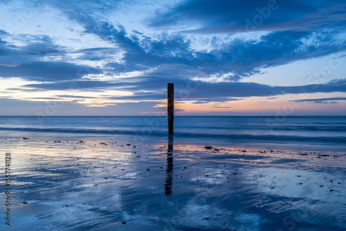 old wooden post in the sea at Swanage Dorset England at sunrise with the sea blurred in the background