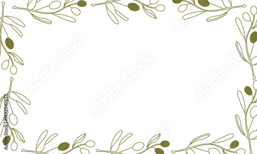 Olive leaves, tree branches and fruits frame. Vector green olives wreath with floral vines, mediterranean cuisine food, vegetable oil and natural cosmetics label. Branches and leaves square frame