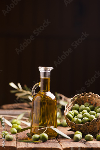 Olive oil and olives on wooden rustic table