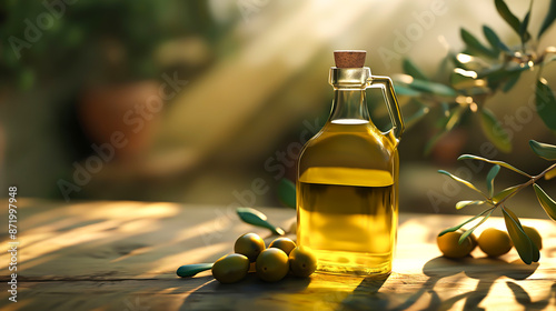 Olive oil in bottle with olives fruit