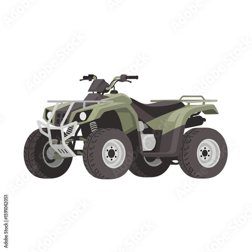 Olive-green all-terrain vehicle, four-wheel drive, profile view, isolated on white background.