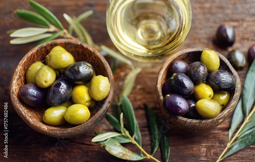 Olives in Wooden Bowls With Olive Oil and Fresh Leaves on a Rustic Wooden Surface