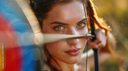 Olympic Winner Paris 2024 Archery Focus on a female archer, Caucasian, 25s, smiling and looking at the camera, aiming at a target, with a field background, empty space center for text