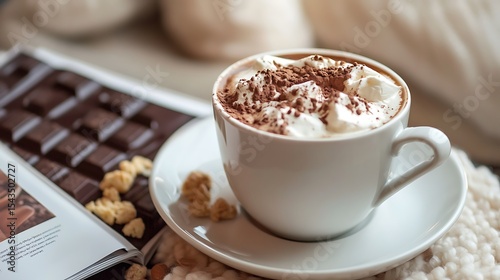 On a table a cup of cappuccino chocolate and open magazines