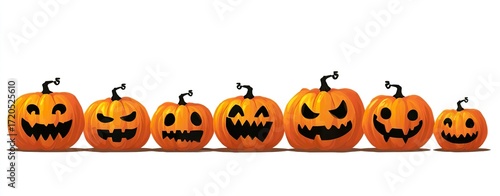 On a white background, orange pumpkin lanterns with various funny expressions are arranged still, with a cartoon texture, full of lively and cheerful Halloween atmosphere.
